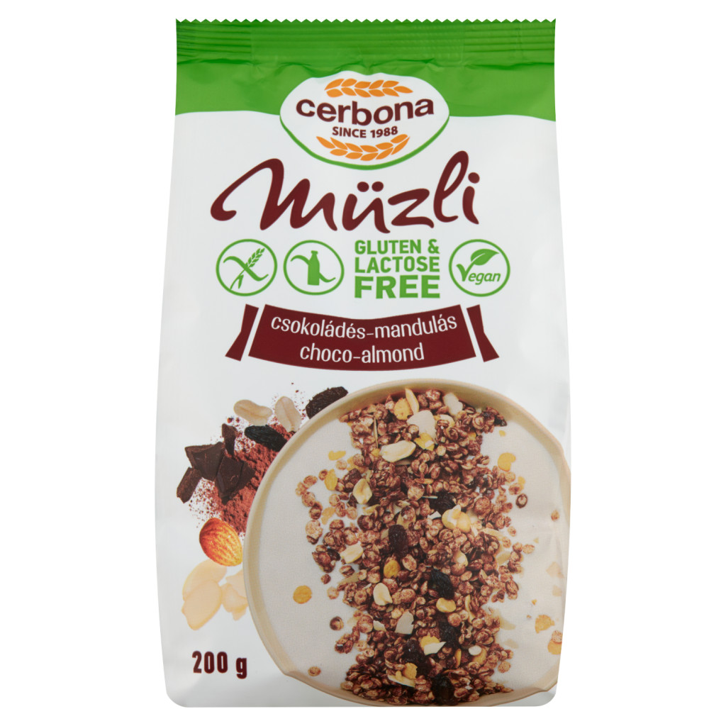 Extrudált gabonapehely (kukoricadara, kakaópor, emulgeálószer: zsírsavak mono- és digliceridjei), Földimogyoró 16%, Glükóz-fruktózszörp, Lapított szójapehely, Szeletelt mandula 7,5%, Növényi zsír (pálma), Mazsola 3,3%, Zsírszegény kakaópor, Cukor, Maltodextrin, Nedvesítőszer: szorbit, Csokoládé 1,7% (kakaómassza, cukor, zsírszegény kakaópor, emulgeálószer: szójalecitin; aroma), Aromák, Emulgeálószer: szójalecitin
