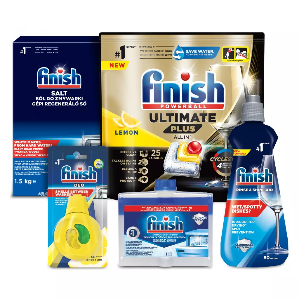 - Finish kezdőcsomag mosogatógéphez, melyben 1 db Citrom és Lime mosogatógép illatosító, 1,5 kg-os regeneráló só, 25 db-os Ultimate Plus All in 1 kapszula, 1 alkalomra elegendő Mosogatógép Tisztító és 80 mosogatásra elegendő Shine & Protect gépi öblítőszer található