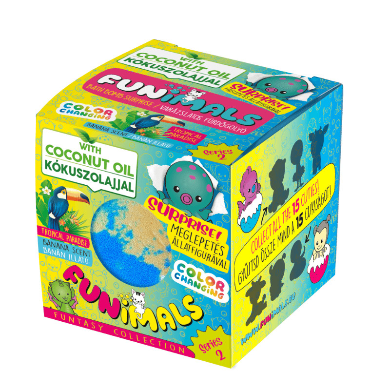 - Felhőtlen szórakozás természetes összetevőkkel – banán illattal. Hosszanható pezsgési idő, intenzíven festi meg a vizet, változatos illat, esszenciális illóolajokat tartalmaz (eredeti francia, 100%-ig természetes). A fürdőgolyó belsejében minőségi gyűjthető állatkák, az első szériában 15 féle állatkával.