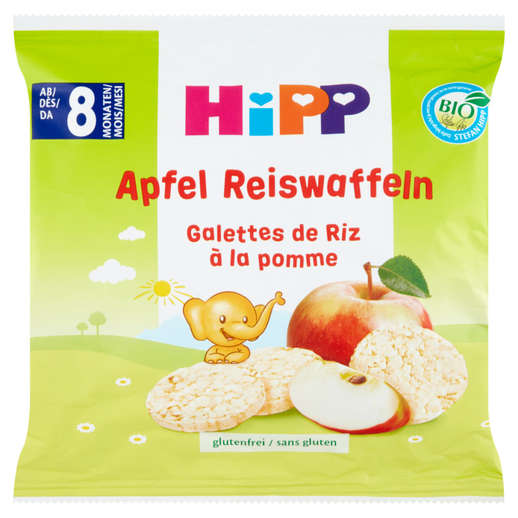 - A HiPP Bio Almás rizskorong bio puffasztott rizsből, bio almalé-sűrítmény hozzáadásával készült, főétkezések között, vagy útközben is fogyasztható.