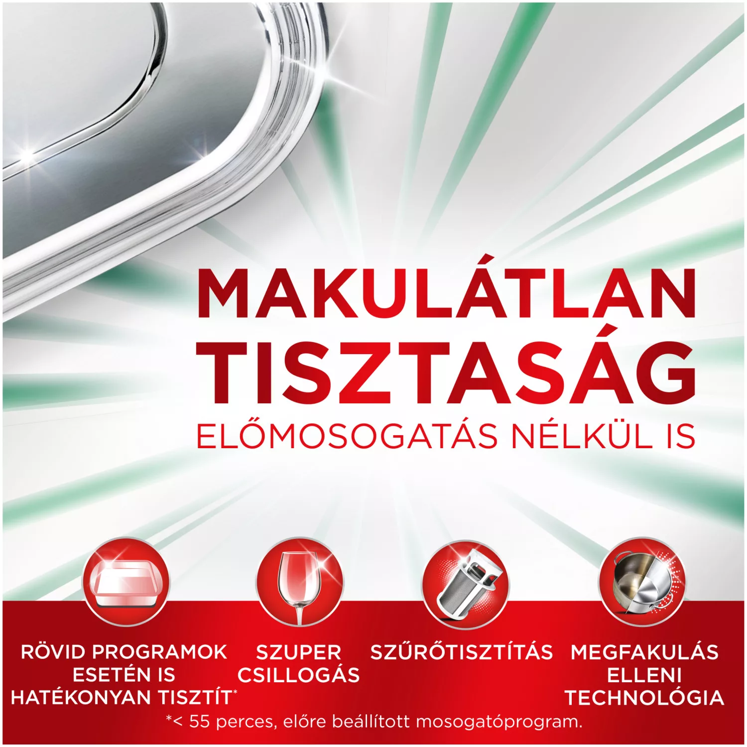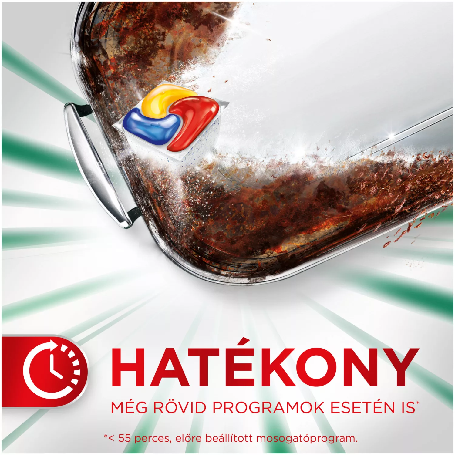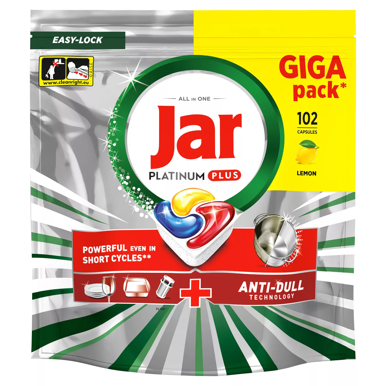 A Jar Platinum Plus all-in-one mosogatókapszula a megújulás erejével tisztítja meg az edényeket, és a Jar makacs ételszennyeződések elleni legkiválóbb megoldását nyújtja. Még az idővel képződött fakó réteget is segít eltávolítani az edényekről, helyreállítva azok eredeti ragyogását. Kiváló tisztítóhatásának köszönhetően a Jar Platinum Plus a rászáradt ételmaradványokat is eltávolítja még a rövid program igénybevételi tesztkörülményei között is. Kevés az ideje? Aggodalomra semmi ok: váltson rövid programra! A Jar egyetlen kapszulában ötvözi a folyékony és a por állagú mosogatószerek erejét. A rendkívül gyorsan oldódó párnácska szinte azonnal kifejti tisztító hatását, így rövid programok esetén is gyorsan és hatékonyan elvégzi a munkát. Ráadásul rendkívül egyszerűen használható: nem kell kicsomagolni, egyszerűen csak helyezze a kapszulát a mosogatógép mosogatószer-adagolójába! Váltson rövid programra*, hogy időt, energiát és vizet takaríthasson meg az általános, standard programokhoz képest!