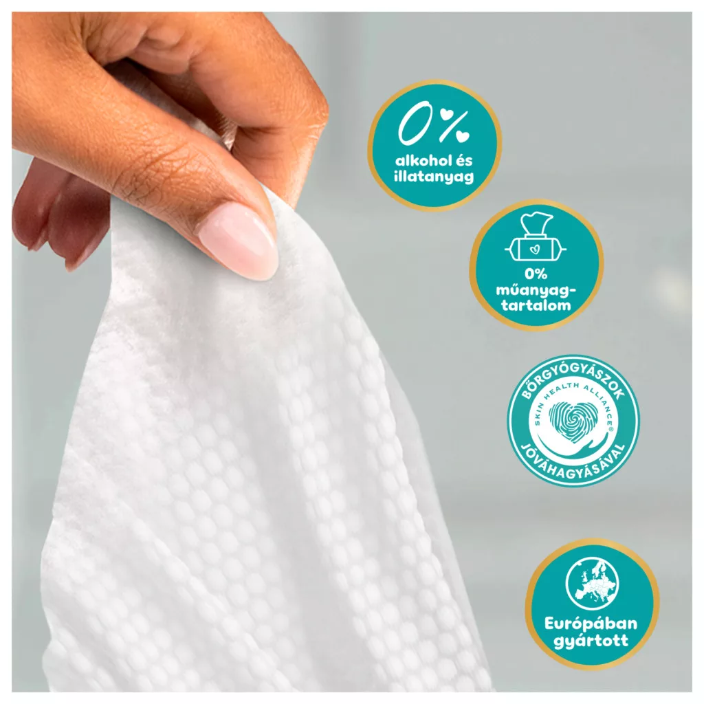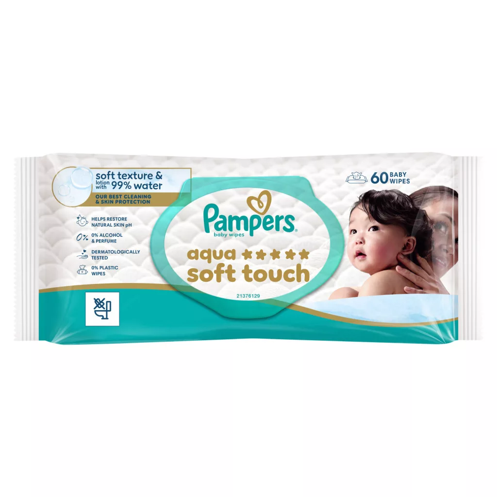 Pampers Aqua Soft Touch Nedves Törlőkendő – A Pampers legkiválóbb tisztítóhatása és bőrvédelme. A puha szerkezetű és 99%-ban vízalapú bőrápoló balzsamot tartalmazó Pampers törlőkendők gyengéden tisztítanak és segítenek megóvni a kisbaba finom bőrét. A különleges formulának köszönhetően segít helyreállítani a bőr természetes pH-értékét és védelmet nyújt a bőr kipirosodása ellen. 0% alkohol és illatanyag felhasználásával készül. Bőrgyógyászatilag tesztelt formula. A Skin Health Alliance bőrgyógyászai által jóváhagyott termék.