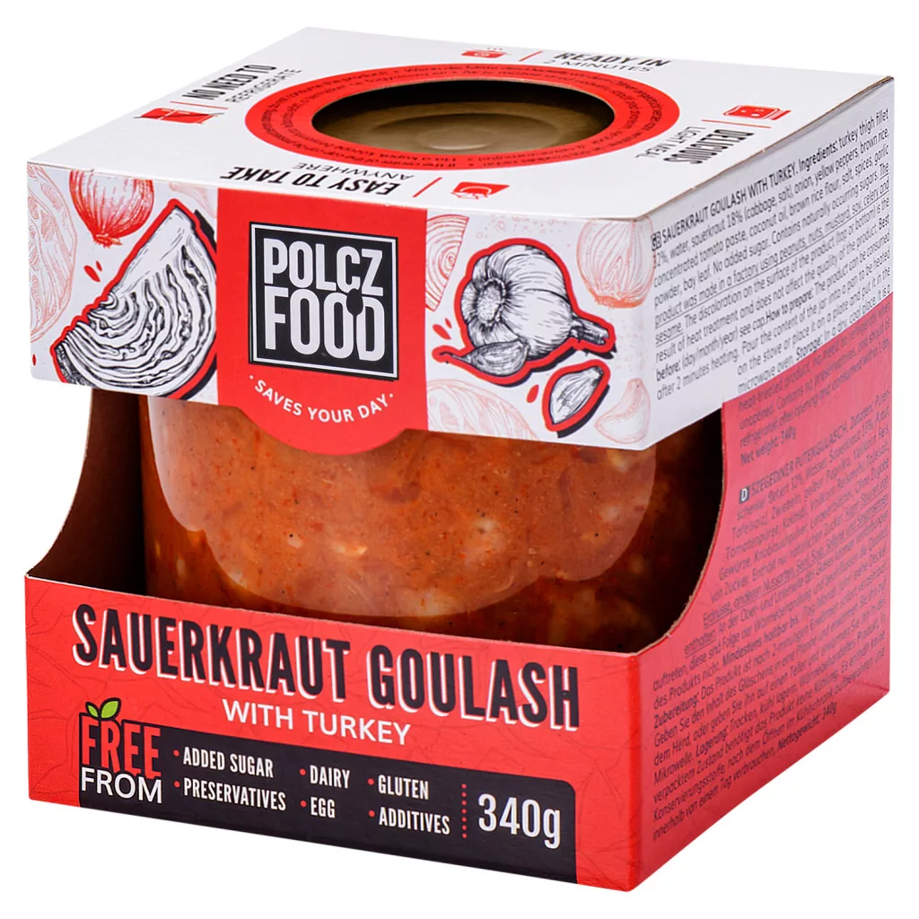 Pulykacombfilé 32%, Ivóvíz, Vecsési savanyított káposzta 18% (fejes káposzta, étkezési só), Vöröshagyma, Barna rizs, Paprika, Sűrített paradicsom, Kókuszolaj, Barna rizsliszt, Étkezési só, Fűszerek, Fokhagymapor, Babérlevél