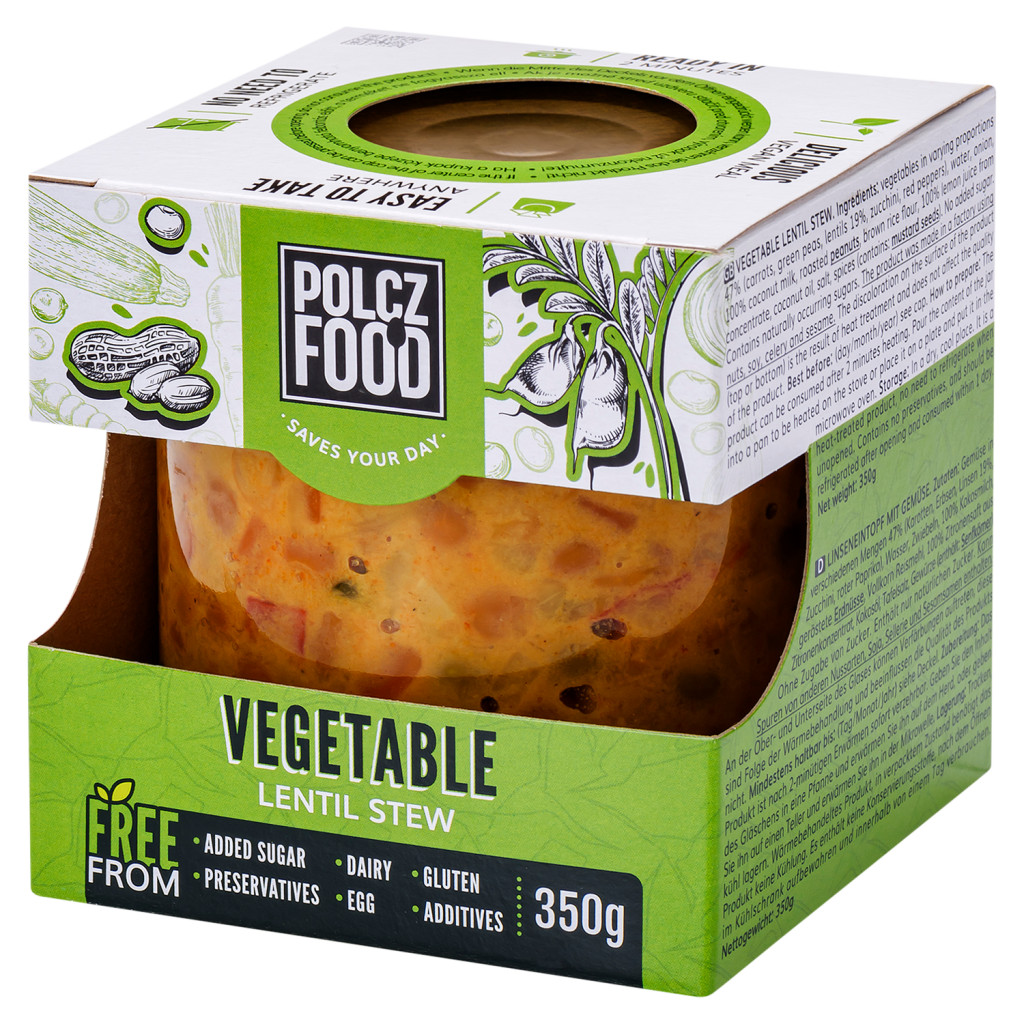 Zöldségek változó arányban 47% (sárgarépa, zöldborsó, lencse 19%, cukkini, pritamin paprika), Ivóvíz, Vöröshagyma, 100%-os kókusztej, Pörkölt földimogyoró, Barna rizsliszt, 100%-os citromlé sűrítményből, Kókuszolaj, Étkezési só, Fűszerek (tartalmaz: mustármag)
