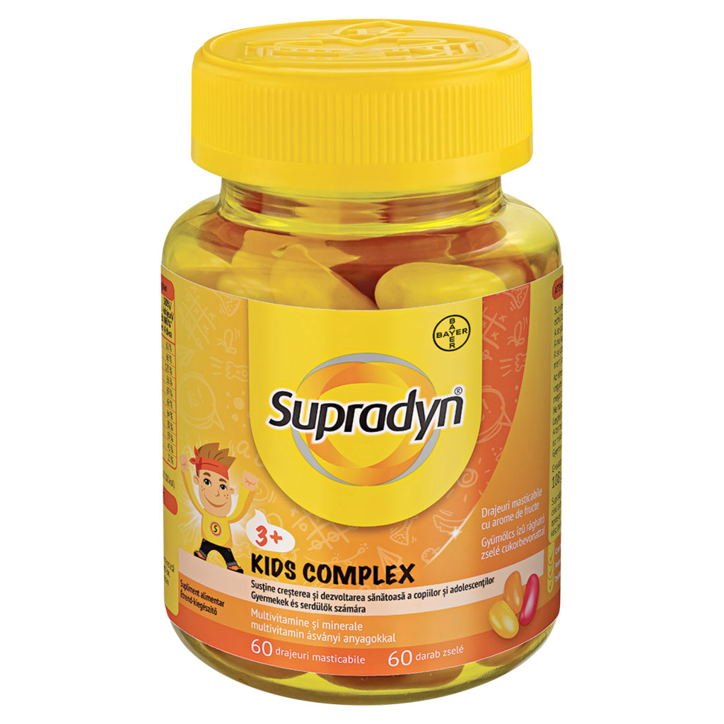 Cukor, Glükóz-szirup, Zselésítőanyagok (oxidált keményítő, acetilezett keményítő), A-vitamin (retinil-palmitát), D-vitamin (kolekalciferol), E-vitamin (DL-alfa-tokoferil-acetát), Biotin (D-biotin), Niacin (nikotinamid), B12-vitamin (cianokobalamin), B6-vitamin (piridoxin-hidroklorid), C-vitamin (L-aszkorbinsav), K-vitamin (fitomenadion), Kálium-jodid, Cink-szulfát, Savanyúságot szabályozó anyagok (citromsav, nátrium-citrátok), Növényi olaj (olíva), Színezékek (ízesítéstől függően répa-, tök-, feketeribizli- és almakoncentrátumok), Aromák, Fényesítő anyagok (fehér és sárga méhviasz, karnaubaviasz, sellak)
