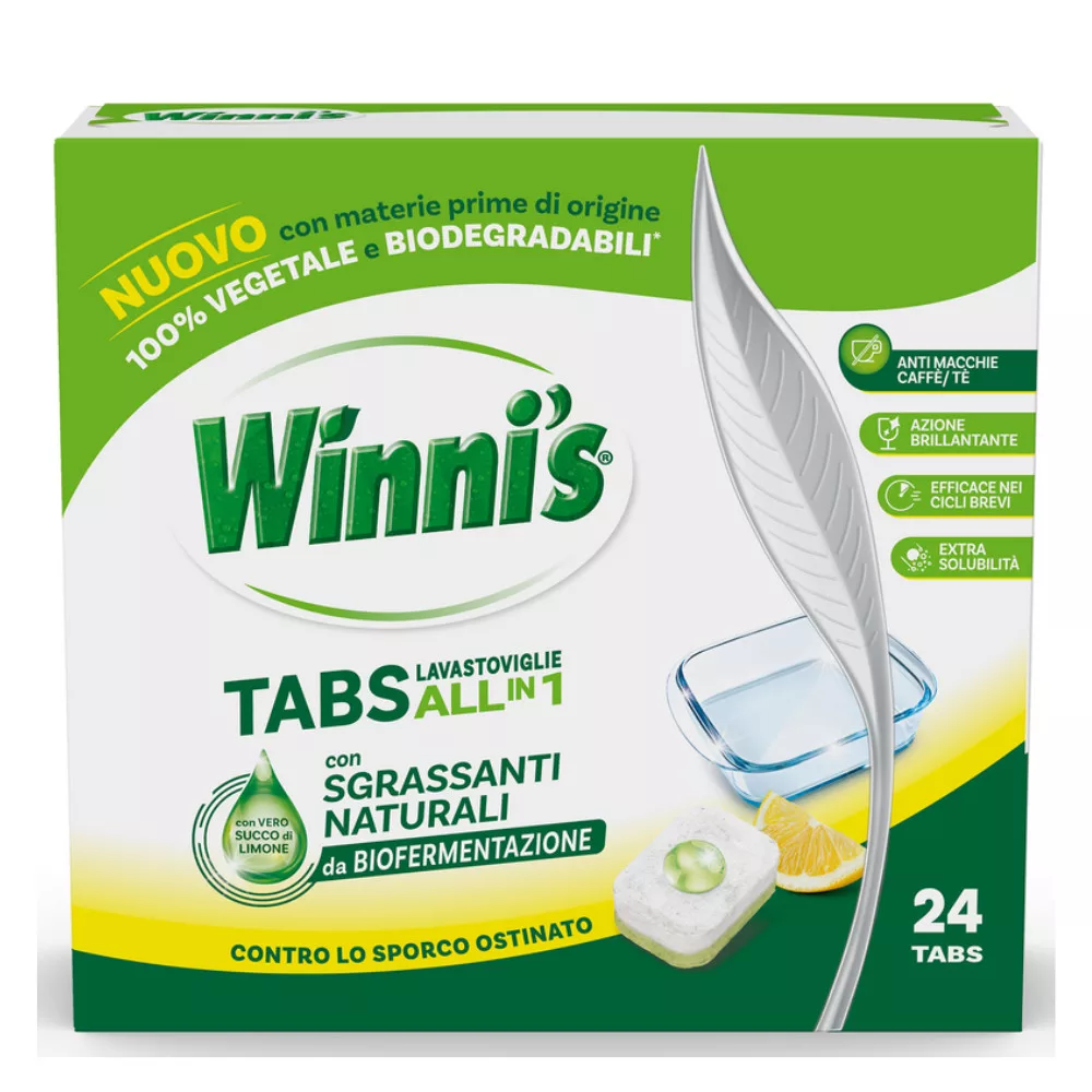 Sodium carbonate (nátrium‑karbonát) — lúgos só, segíti a zsírok, ételmaradék és szennyeződések oldását. Sodium citrate (nátrium‑citrát) — vízkeménység‑lágyító / szekvesztráló hatású anyag. Sodium percarbonate — oxidáló fehérítő hatás (szennyeződések, foltok fehérítése/eltávolítása). Methylglycine triacetic acid — szekvesztráló / diszpergáló segédanyag, segít a hatékonyságban. Sodium chloride — ásványi só, stabilizáló komponens. Tetrasodium iminodisuccinate — vízlágyító / szennyezés‑eltávolítást segítő anyag. Sodium silicate, soda ash, sodium bicarbonate — stabilizálók, lúg‑alkalinitás szabályozók. Sodium sulfate — ásványi só, a formula stabilitásáért. Enzimek — biológiai úton lebomló fehérjék, amelyek segítenek az ételmaradékok, szerves szennyeződések lebontásában. Deceth‑6 — növényi eredetű felületaktív anyag (surfaktáns), javítja a tisztító teljesítményt. Tetraacetylethylenediamine (TAED) — segédanyag, amely az oxidáló fehérítő hatást (sodium percarbonate) aktiválja, különösen alacsony hőfokon. Sodium gluconate — szekvesztráló / vízkeménység ellen ható segédanyag. Fatty alcohol polyglycolether — növényi‑eredetű nemionos surfaktáns, hozzájárul a mosogatás hatékonyságához. Sodium carboxymethyl inulin — diszpergáló / segédanyag a jobb oldódásért. Microcrystalline cellulose — stabilizátor, segít a tabletta szerkezetének megtartásában. Parfum (illatanyag) — illatosítja a mosást, általában legalább részben biológiailag lebomló alapanyagokból.