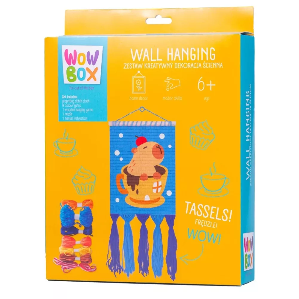 Kiváló minőségű fonalak gyönyörű, intenzív színekben. Az elkészült makramé ideális dísze lehet a szobának. A könnyebb használat érdekében a szöveten egy mintával ellátott nyomtatás található. Tökéletes módja a kikapcsolódásnak és kreativitás időtöltésnek.