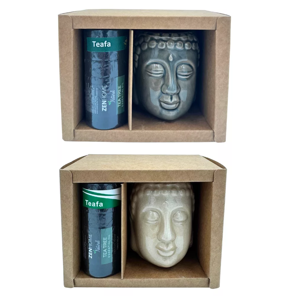 Ez a Zen Home Teafa Ajándékszett tökéletes választás mindazoknak, akik a természetes felfrissülést és a letisztult, békés hangulatot keresik otthonukban. A csomag egy illóolajat és egy különleges, Buddha-alakú kerámia párologtatót tartalmaz, így azonnal használatba vehető vagy ajándékként is átadható.